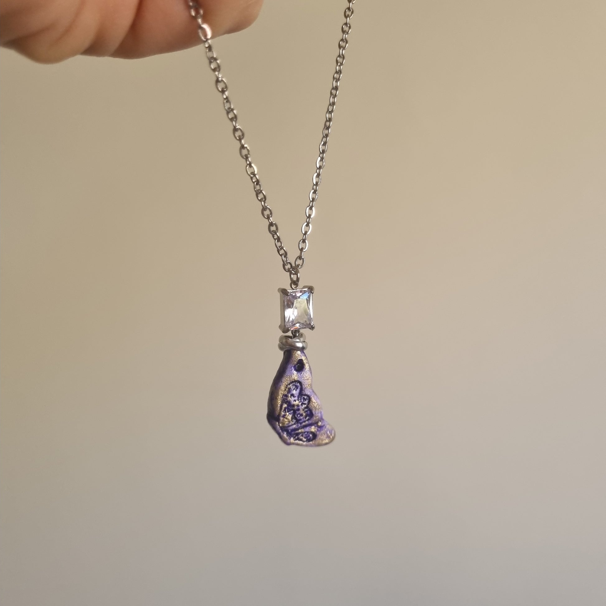 Lasciati conquistare dalla magia della luce con questa collana artigianale Luce Mistica. Un gioiello unico con frammento d'arte viola e cristallo.