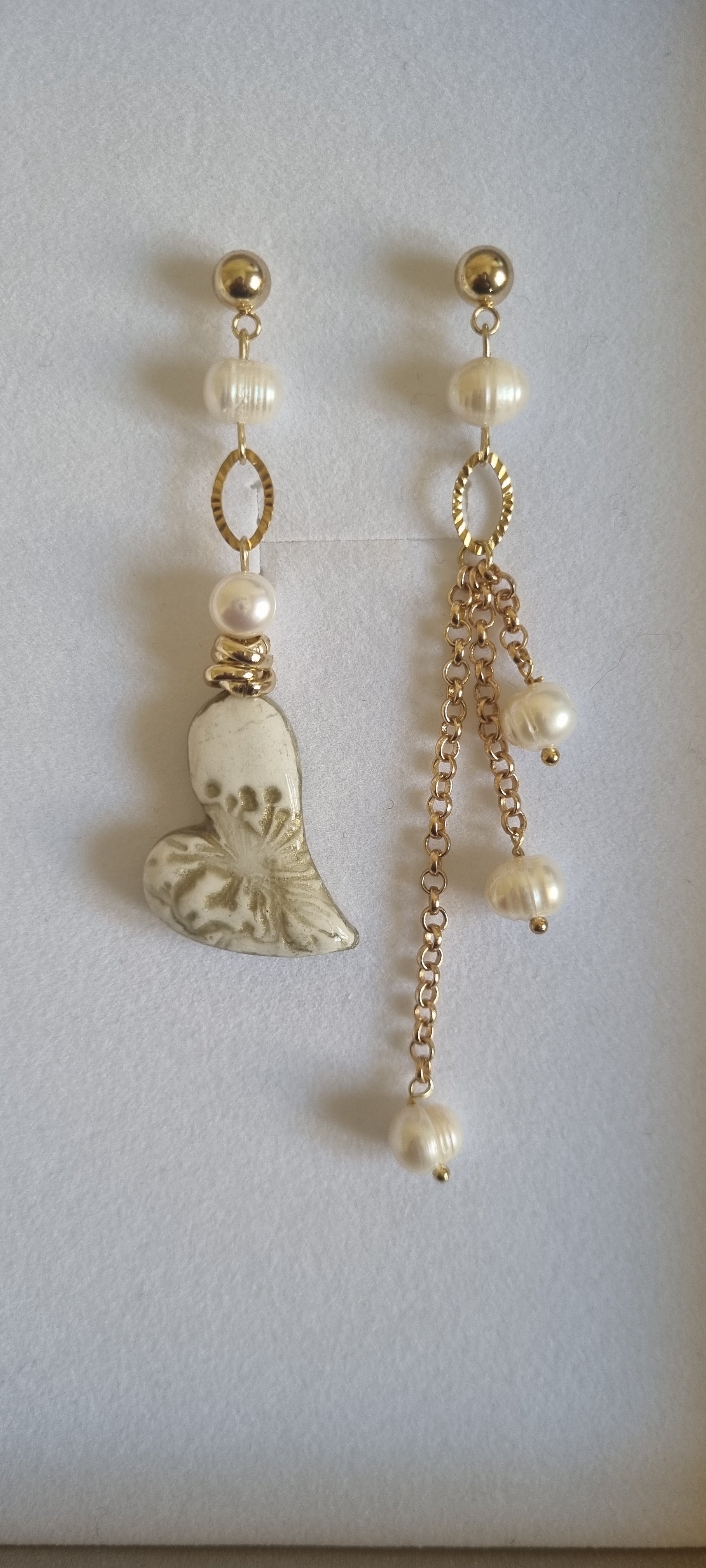 Ogni orecchino racconta una storia diversa: da un lato, un delicato cuore in ceramica realizzato a mano con motivi floreali dorati, impreziosito da perle naturali d'acqua dolce e dettagli in acciaio inox dorato. Dall'altro, una cascata di perle barocche sospese su catenelle dorate che creano un movimento fluido e raffinato.