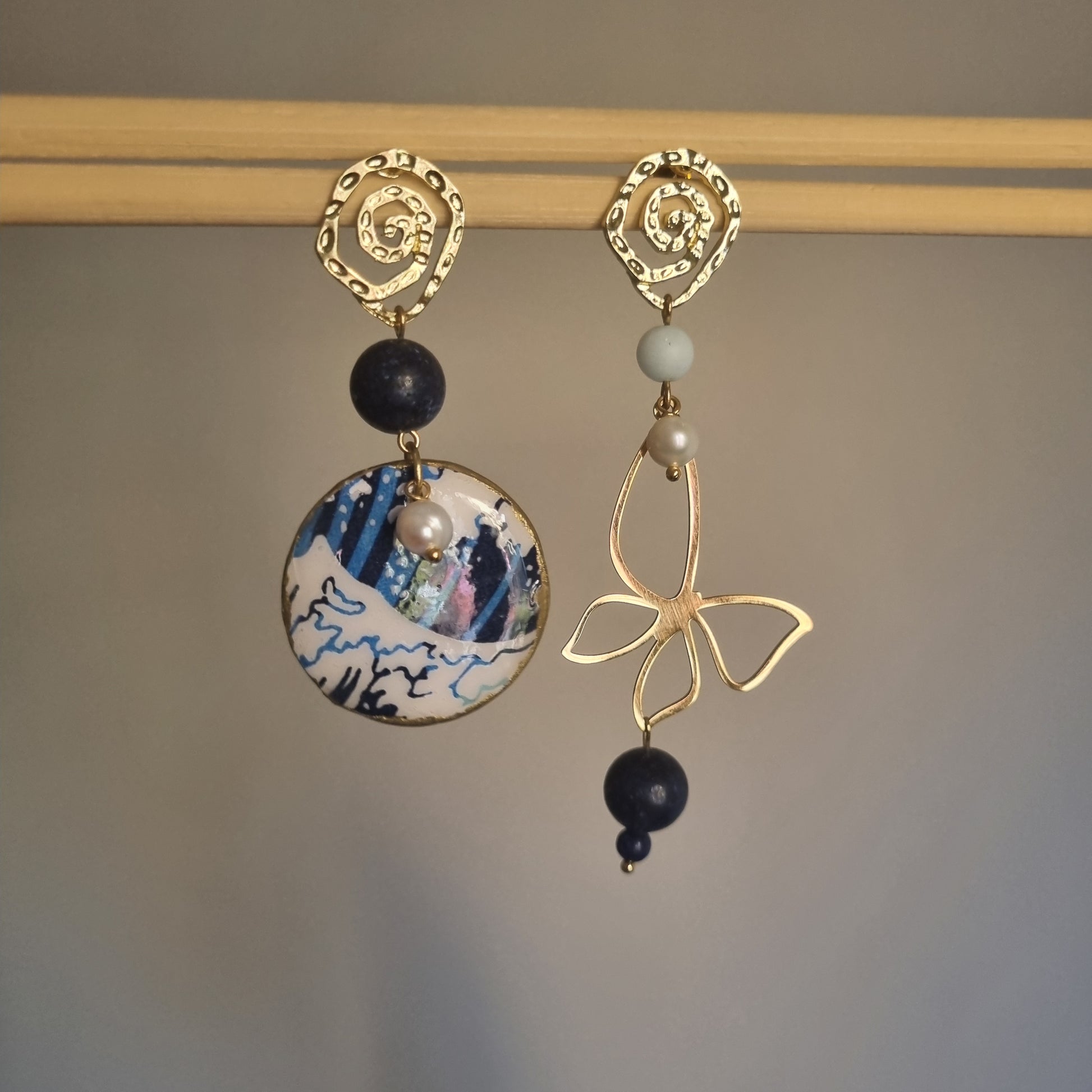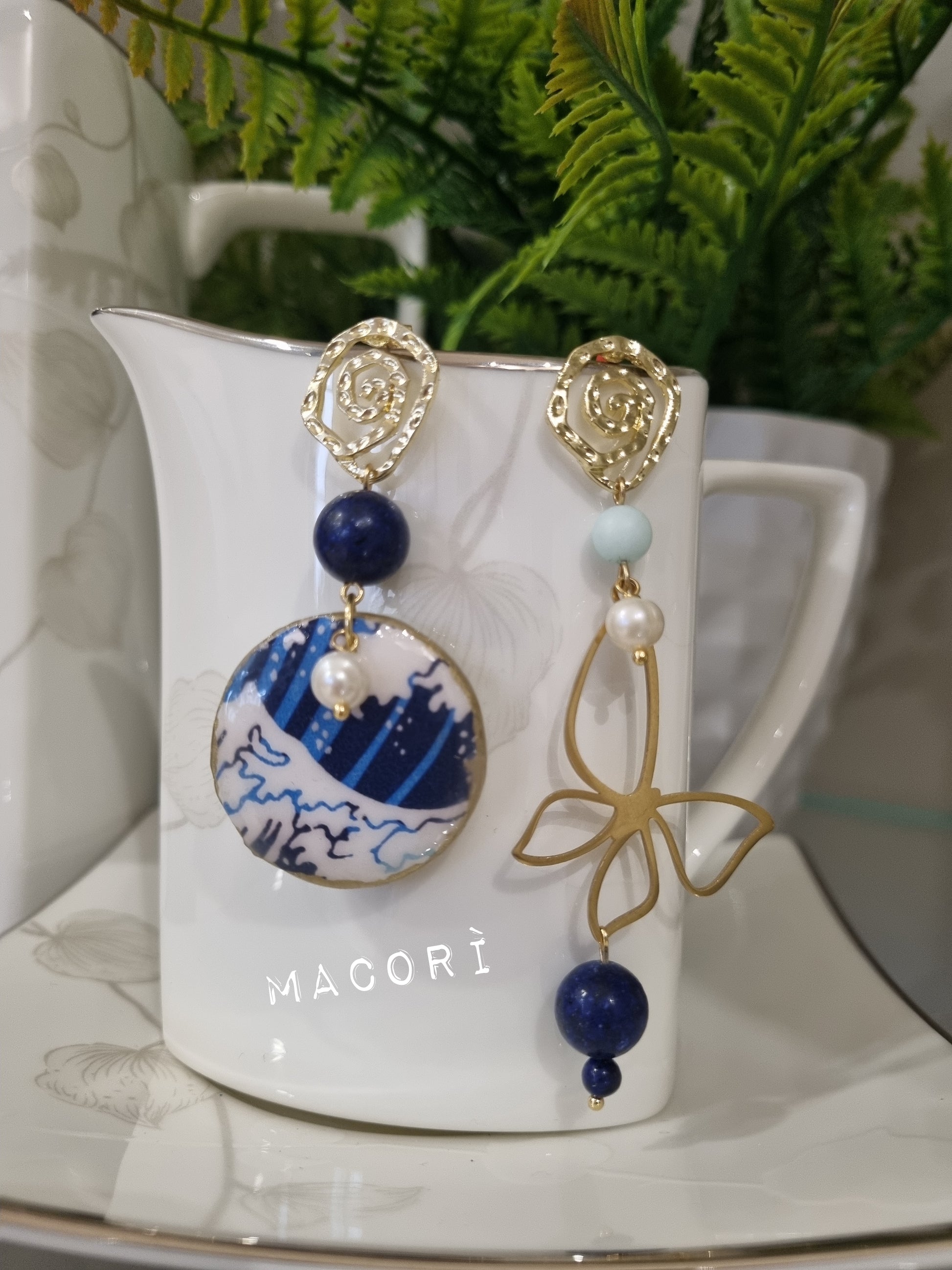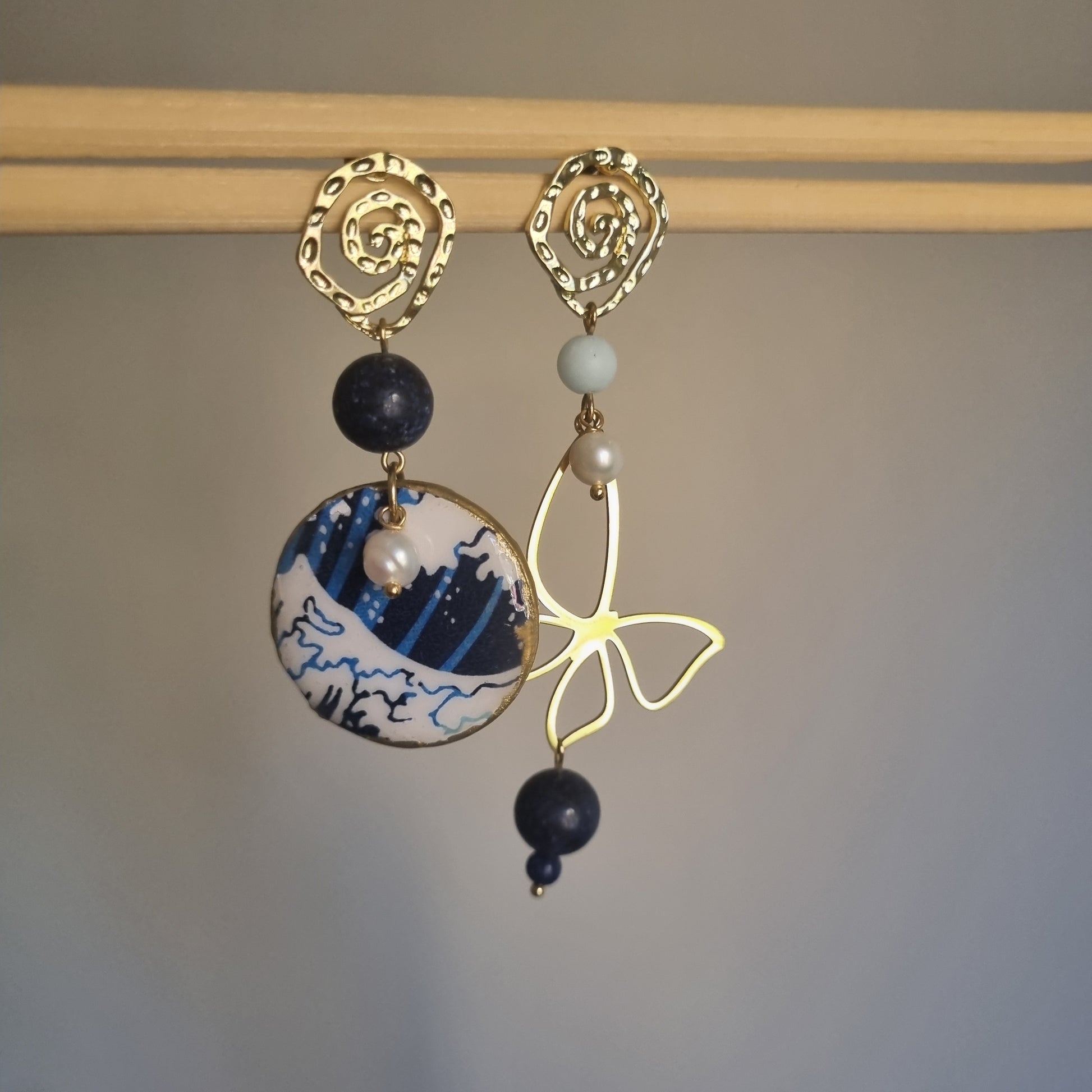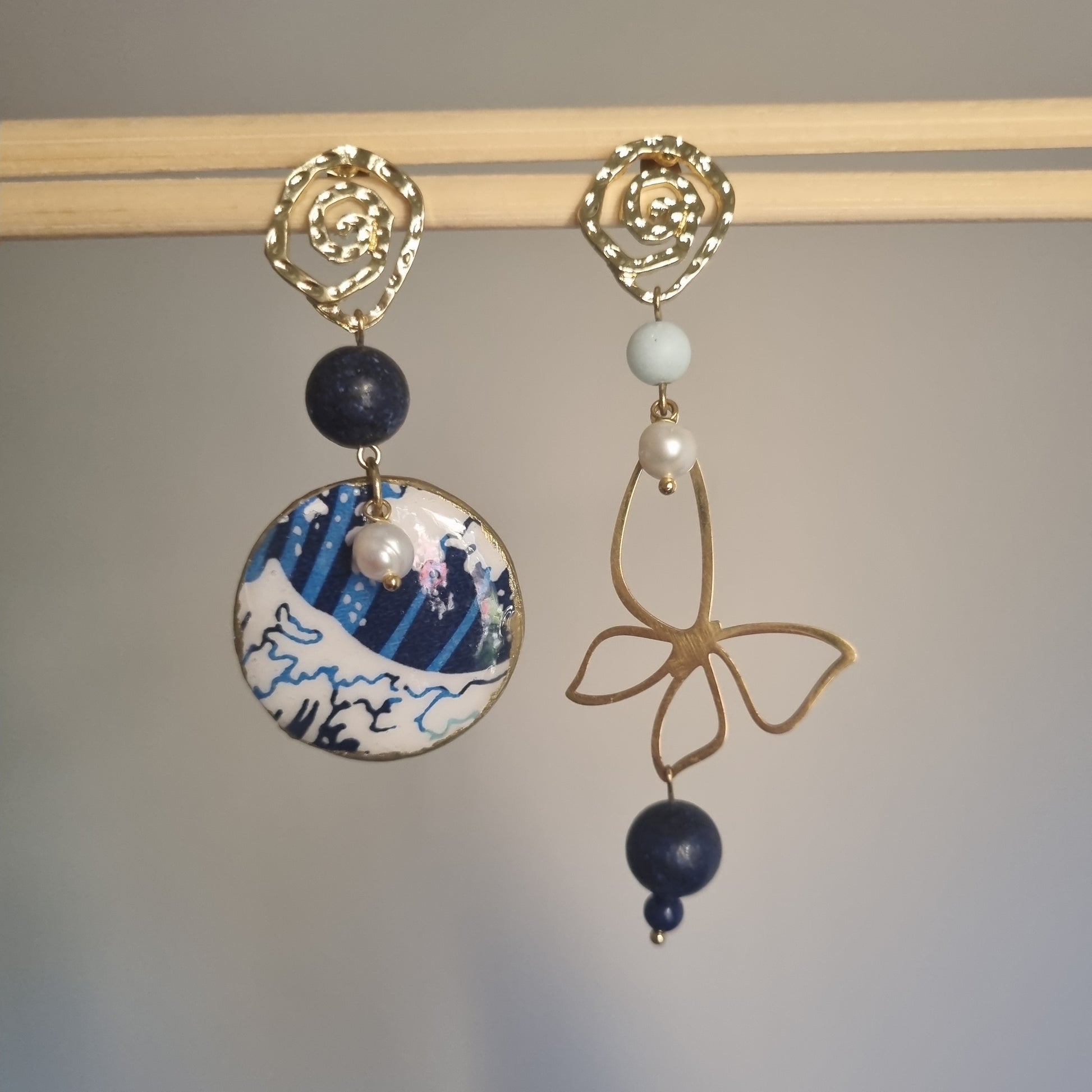 Orecchini Asimmetrici Onda Giapponese con Lapislazzuli e Perle - Gioielli Artigianali