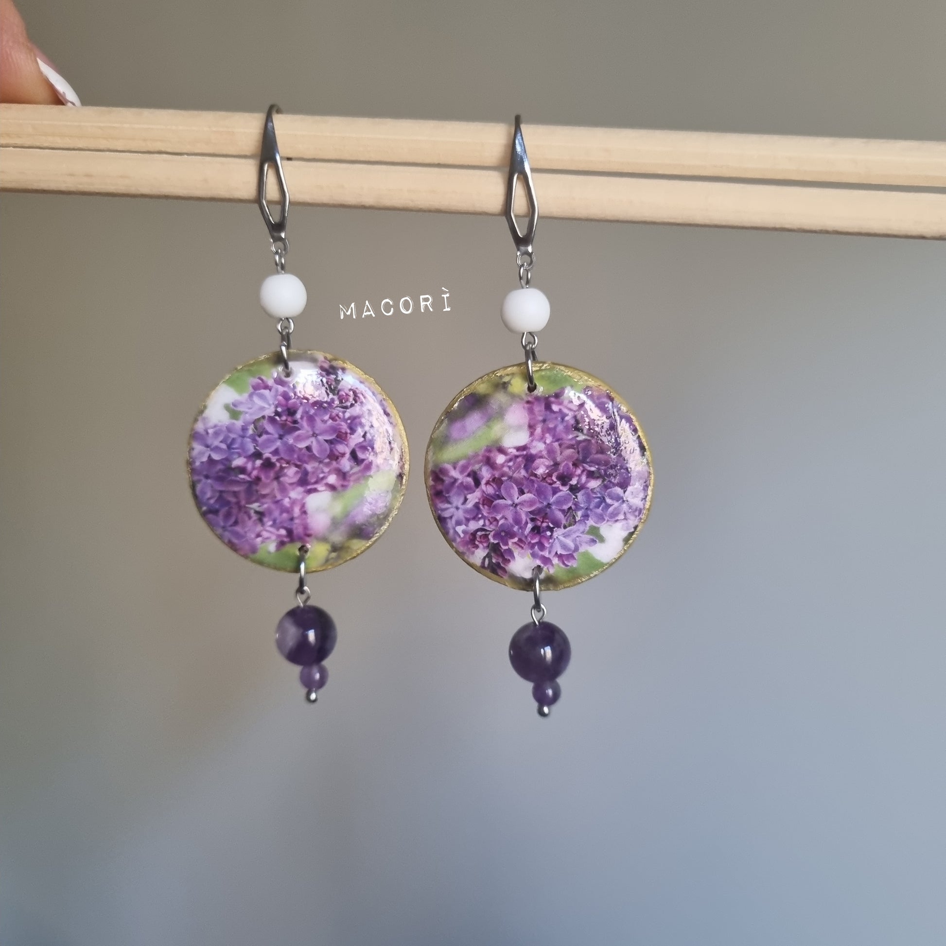 Lasciati incantare dalla bellezza della natura con questi orecchini artigianali in legno che catturano la delicatezza delle ortensie viola in piena fioritura. Un gioiello d'autore che unisce arte floreale dipinta a mano, pietre naturali e design raffinato.